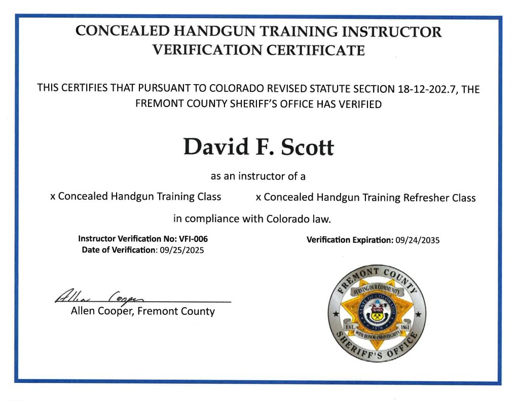 Pursuant to Colorado Law, I am now certified as a Concealed Handgun Trainer,